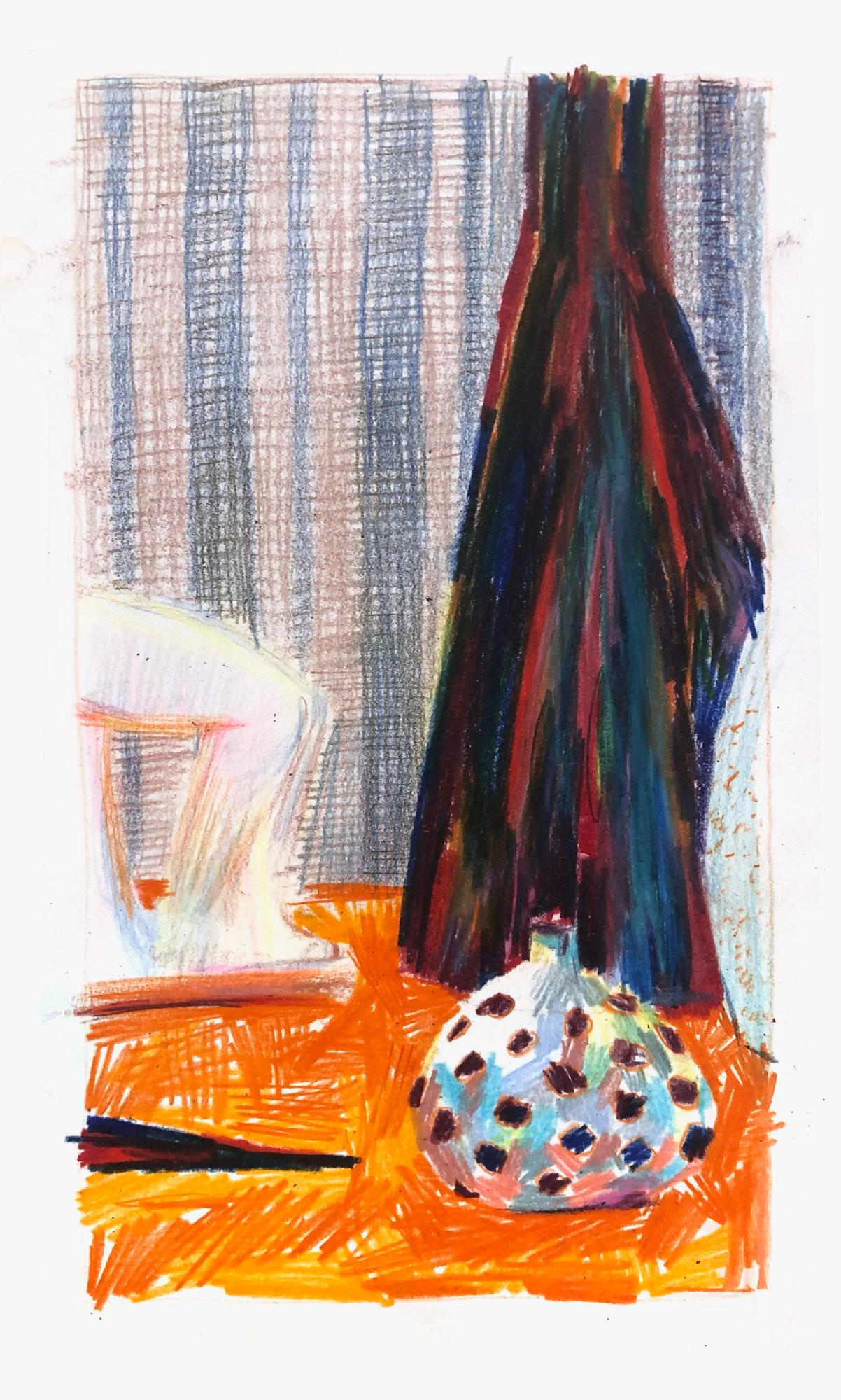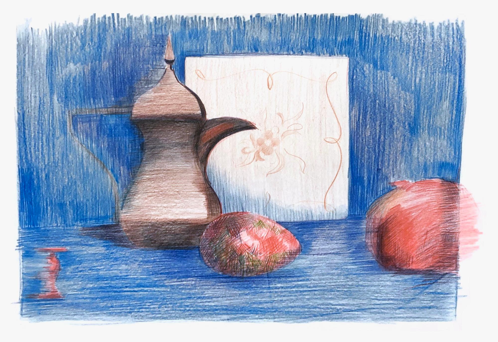 В качестве натуры будут натюрморты с узорчатыми драпировками и цветным стеклом. На них вы потестите два решения: первым слоем гуашь, поверх нее карандаши — потом наоборот.