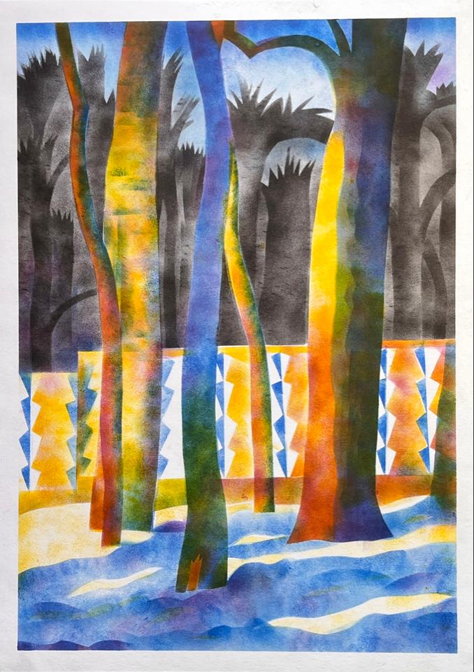 Напечатаете в трафарете сложный пейзаж по фотореференсу. Будете упрощать и трансформировать натуру, чтобы, с одной стороны, изобразить ее простыми формами. А с другой — не потерять сложность рисунка.